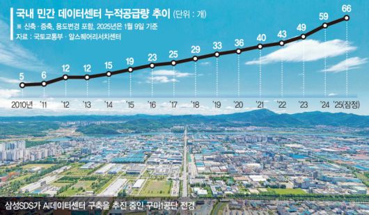 11일 업계에 따르면 글로벌 빅테크 기업들과 국내 대형사들이 AI 데이터센터 구축에 적극 협력하면서 민간 데이터센터 공급은 꾸준히 늘고 있다. 상업용 부동산 서비스기업 알스퀘어 리서치센터와 국토교통부에 따르면 민간 데이터센터 공급량은 신축과 증축, 용도변경 등을 모두 포함해 2010년 전국 5개에서 10년 후인 2020년 36개로 늘었다. 지난해에는 1월 9일 기준 66개로 확대돼 최근 5년 새 두배 가까이로 크게 증가했다.
