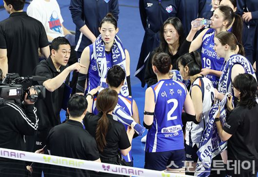[화성(경기)=스포츠투데이 권광일 기자] 2025-2026 진에어 V-리그 여자부 IBK기업은행-현대건설 경기가 11일 경기도 화성시 화성종합경기타운에서 열렸다. IBK기업은행 여오현 감독대행이 작전타임을 갖고 있다. 2026.01.11. [스포츠투데이 권광일 기자 sports@stoo.com]