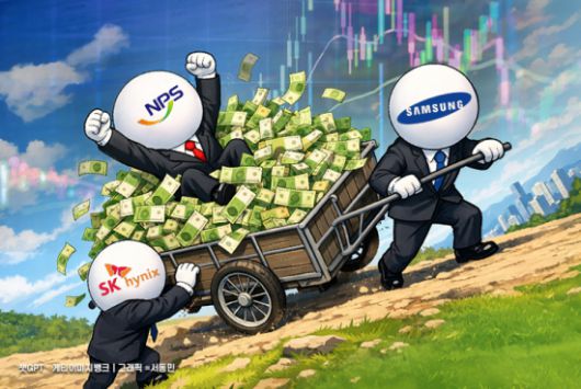 한 분기 만에 주식 평가액이 70조원 가까이 늘어난 데에는 '반도체 쌍두마차' 대형주들의 주가가 크게 오른 점이 작용했다. 삼성전자와 SK하이닉스는 4분기 평가액이 가장 많이 늘어난 종목으로, 각각 26조1882억원, 21조967억원 증가했다. 지난해 4분기 국민연금 전체 주식 평가액 증가분에서 두 회사가 차지하는 비중은 67.85%다. 삼성전자의 지분율은 7.75%, SK하이닉스의 지분율은 7.35%다. 양 사에 대한 국민연금 지분율이 지난해 3분기 말과 동일하다는 점을 고려하면 주가 상승이 평가액을 크게 끌어올렸음을 알 수 있다.