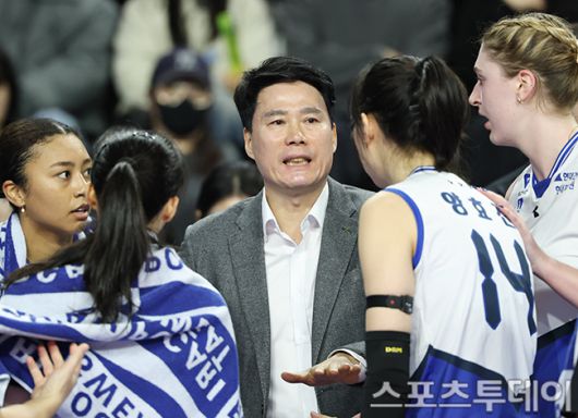 [화성(경기)=스포츠투데이 권광일 기자] 2025-2026 진에어 V-리그 여자부 IBK기업은행-현대건설 경기가 11일 경기도 화성시 화성종합경기타운에서 열렸다. 현대건설 강성형 감독이 선수들과 이야기를 하고 있다. 2026.01.11. [스포츠투데이 권광일 기자 sports@stoo.com]