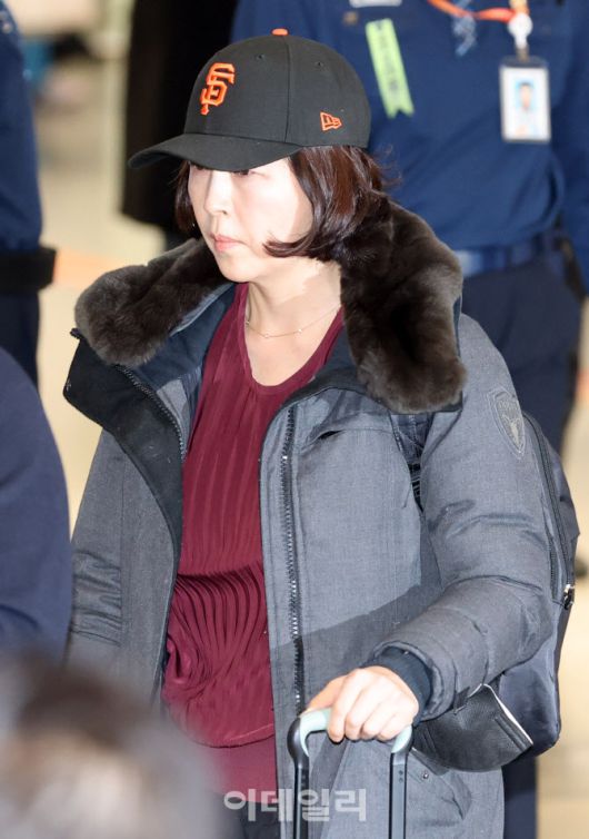 오후 7시 16분께 입국장을 통해 모습을 드러낸 김 시의원은 검정 패딩에 미국 프로야구 샌프란시스코팀 모자를 푹 눌러쓴 상태였다.