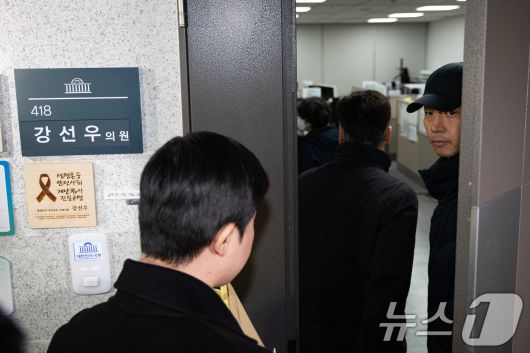 (서울=뉴스1) 유승관 기자 = 11일 서울 여의도 국회 의원회관 강선우 의원 사무실에 의원실 관계자 및 경찰 관계자들이 들어서고 있다. 서울경찰청 광역수사단 공공범죄수사대는 이날 '공천 헌금 의혹' 관련 강 의원 주거지와 국회의원회관 사무실, 김경 서울시의원 거주지 및 의회 연구실 등에 대해 압수수색을 실시하고 있다. 2026.1.11/뉴스1
