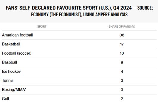 영국 경제지 이코노미스트에 따르면 미국인의 10%가 축구를 가장 좋아하는 스포츠로 선택했으며, 이는 9%에 그친 야구를 근소하게 앞선 수치다. 축구는 미식축구와 농구에 이어 전체 선호도 3위에 올랐다.