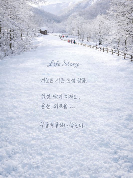 겨울이라는 글자를 말하면, 겨울에만 즐길 수 있는 것들이 자동으로 떠오른다. 그런데 역설적으로 '겨울이니까' 자꾸 내일로 미루게 된다. 춥다는 이유로, 날이 조금 풀렸다는 이유로 미루다 보면 겨울은 녹아버린다. 그렇게 겨울은 망설이는 사이 가장 좋은 시간이 사라진다. 그래서 '시즌 한정'을 붙잡아보자는 이야기다.