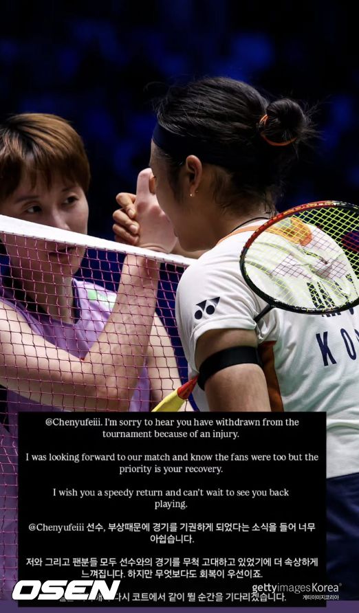 [OSEN=우충원 기자] 안세영(삼성생명)이 최대 라이벌 천위페이(중국)의 기권 소식에 빠른 회복을 전했다.