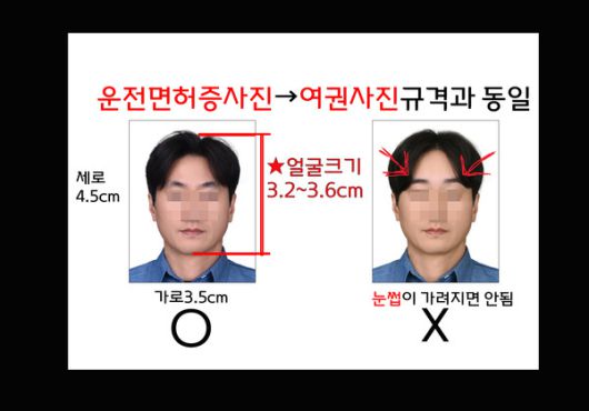 사진규격 3.5-4.5cm 사이즈는 기존처럼 같지만, 얼굴크기가 커야된다. 턱에서 머리정수리까지 3.2-3.6cm 얼굴이 여권사진처럼 커야된다.
