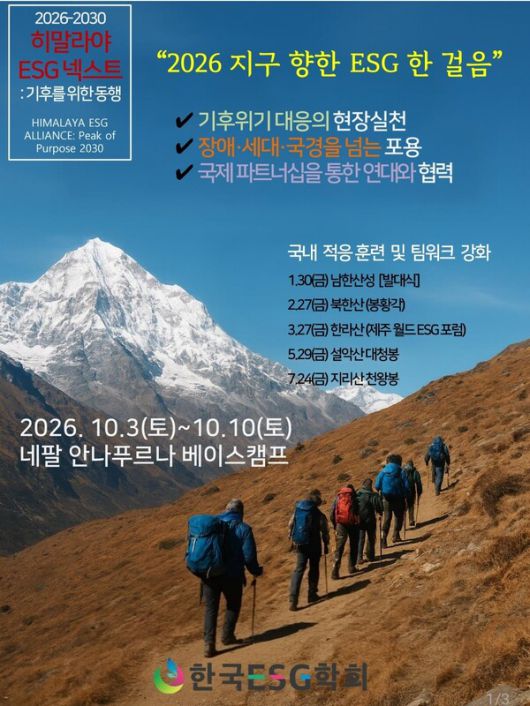 한국ESG학회(회장 고문현)는 2026년 10월 3일부터 10일까지 네팔 안나푸르나 베이스캠프(ABC) 일대에서 진행되는 '히말라야 ESG 원정대' 참가자를 모집한다고 밝혔다. 이번 원정은 기후위기 대응, 장애·세대·국경을 넘는 포용, 국제 연대를 핵심 가치로 내세운 실천형 ESG 프로젝트다.