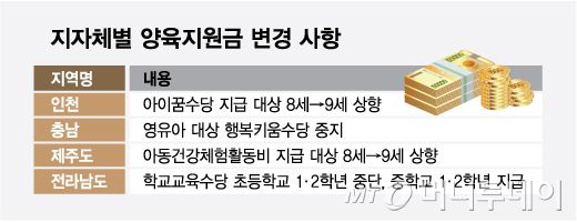 올해 국가가 지급하는 양육수당(월 10만원)이 8세(2017년생)로 확대될 가능성이 높아지면서 전국 지방자치단체들이 '중복지원'을 피하기 위해 지원금을 조율하고 있다. 빠듯한 재정부담을 덜기 위해서다. 다만 일부 지자체에서는 여전히 현금성 지원을 통한 지역 살리기에 나서고 있어 지역별 양육수당 격차는 지속될 것으로 예상된다.