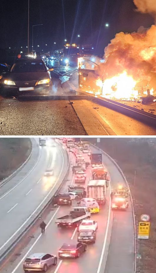 불타고 뒤엉킨 차량들 10일 서산영덕고속도로 경북 구간에서 발생한 추돌 사고로 승용차가 불에 타고 있다(위쪽 사진). 아래쪽 사진은 사고 당시 한국도로공사 폐쇄회로(CC)TV에 찍힌 다중추돌 장면. 이날 서산영덕고속도로와 경북 성주군 일대에서 교통사고가 잇따라 총 7명이 숨지고 9명이 다쳤다. 경찰과 소방당국은 사고 원인을 한파로 인해 도로에 얇게 형성된 결빙인 ‘블랙아이스’로 추정하고 있다. 경북소방본부 제공·한국도로공사 CCTV 화면 캡처 |