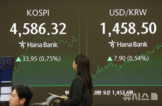 [서울=뉴시스] 배훈식 기자 = 코스피가 종가 기준 최고치를 기록한 9일 오후 서울 중구 하나은행 딜링룸 전광판에 코스피가 전 거래일 보다 33.95 포인트(0.75%) 오른 4586.32 포인트를 나타내고 있다. 원달러 환율은 7.90원(0.54%) 오른 1458.50원. 2026.01.09. dahora83@newsis.com |