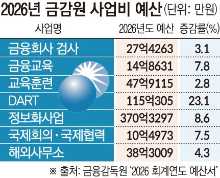 11일 본지 취재를 종합하면 금융감독원은 올해 전자공시시스템(DART)과 정보화 사업에 대규모 투자를 단행한다. 본지가 확보한 ‘금감원 2026 회계연도 예산서’에 따르면 금감원의 전체 사업비 예산은 624억3592만 원으로 전년(567억7972만 원) 대비 10.0% 증가했다. 이 가운데 정보화 사업(370억3296만 원)과 DART(115억305만 원) 예산이 전체의 77.7%를 차지했다.