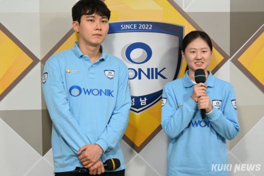 바둑리그 원익 4지명 김은지 9단(오른쪽)이 승자 인터뷰를 진행하고 있다. 쿠키뉴스 자료사진 |