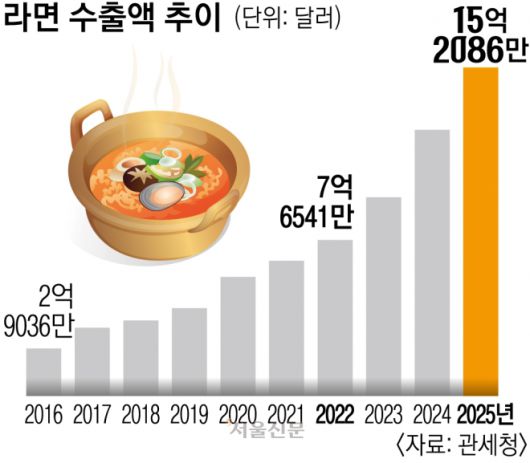 지난해 한국산 라면 수출액이 사상 처음 15억 달러(2조 2000억원)어치를 돌파했다. 개당 1000원으로 계산하면 1초에 70개씩 팔렸다. 영화 기생충에 등장한 ‘짜파구리’와 방탄소년단(BTS)의 ‘불닭볶음면’ 소셜미디어(SNS) 먹방이 불을 붙인 K라면 돌풍을 넷플릭스 애니메이션 ‘케이팝 데몬 헌터스’(케데헌)가 한층 더 가속화하면서 신기록 경신으로 이어졌다.