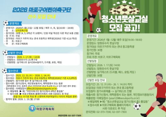 서울 마포구가 ‘2026 마포구어린이축구단’과 ‘2026 마포구청소년풋살교실’ 참가자를 오는 14일까지 모집(포스터)한다.
