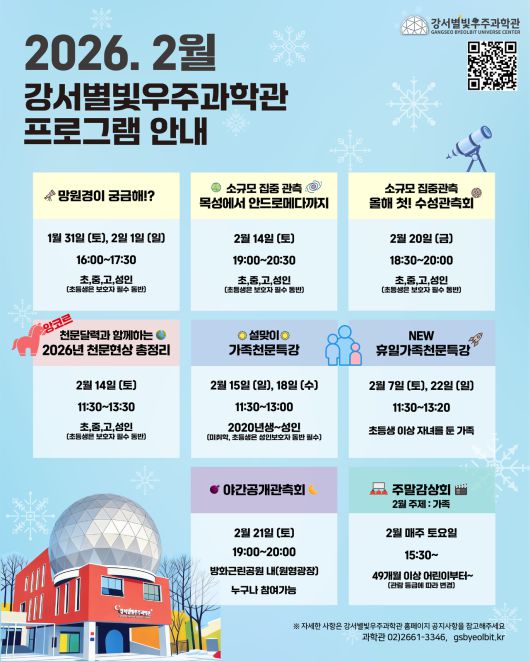 이 밖에도 2월 21일 오후 7시 방화근린공원에서 달과 목성을 관측하는 ‘야간공개관측회’가 진행된다. 2월 7일 및 22일에는 천문학과 로켓 관련 강의 후 한국형 우주발사체인 누리호 모형을 만드는 ‘휴일 가족 천문특강’도 함께한다.