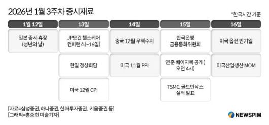 증권가는 1월 셋째 주를 글로벌 물가·통화정책·실적 이벤트가 동시에 맞물리는 분기점으로 보고 있다. 주요 일정 소화 이후 시장의 방향성이 보다 명확해질 수 있다는 점에서, 투자자들은 지표와 이벤트 결과에 따른 시장 반응을 면밀히 점검할 필요가 있다는 평가다.
