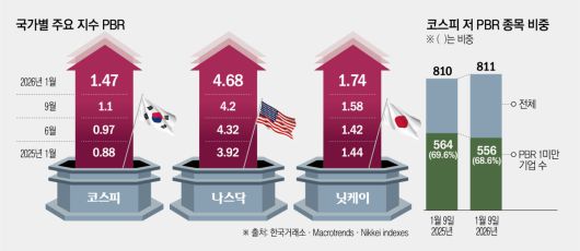 12일 한국거래소에 따르면 코스피 PBR은 1.47배(9일 종가 기준)로 1년 전(2025년 1월 9일) 0.88배보다 크게 상승했다. 지난해 6월 PBR 1배를 돌파한 이후 지수의 가파른 상승과 함께 코리아 디스카운트 해소의 기대감을 키웠다.