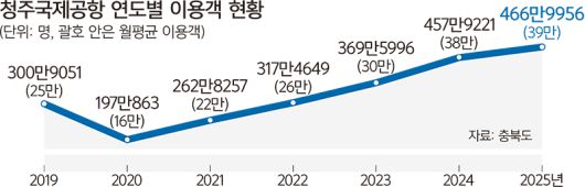 도는 이런 성장세에 힘입어 중부권 거점공항 도약을 핵심과제로 ‘민간전용 활주로 건설’을 추진한다. 올해 초 고시 예정인 제7차 공항개발 종합계획(2026∼2030년)에 이 사업 반영을 위해 민관정이 총력전을 펼친다. 또 행·재정적 지원 근거가 될 ‘청주공항 특별법’ 제정에 힘을 쏟는다.