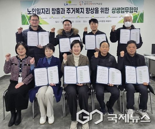 (충주=국제뉴스) 김상민 기자 = 충북 충주문화시니어클럽(관장 박보경)은 주택관리공단이 관리하는 LH임대아파트 7개 단지와 함께 12일 지역사회 발전과 노인복지 증진을 위한 업무협약(MOU)을 체결했다.