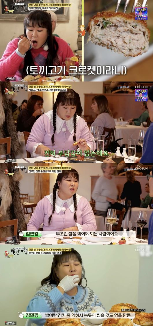 이날 김민경은 토끼고기에 이어 사슴고기까지 도전하며 먹방을 선보였다. 토끼 고기에는 “참치 같다, 맛있다”라고 했고, 사슴고기에는 “고기 누린내도 안나고 오히려 허브 향 때문에 더 고급스럽게 느껴진다”라고 만족감을 드러냈다.
