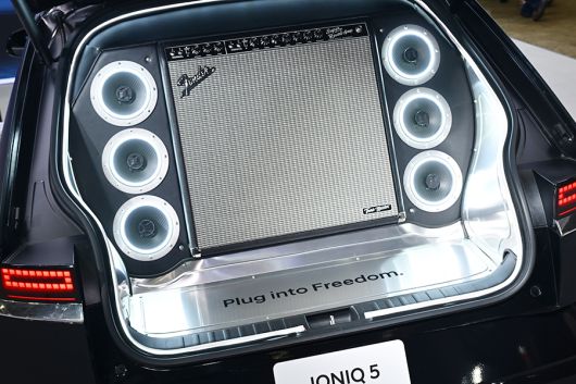 이번 콘셉트카의 백미는 트렁크 공간에 있다. 테일게이트를 여는 순간 드러나는 거대한 기타 앰프와 6개의 스피커 유닛이 시선을 끈다. 여기에 'V2L(Vehicle to Load)'로 공간과 시간에 제약 없는 '연주'의 자유를 선명히 드러낸다.