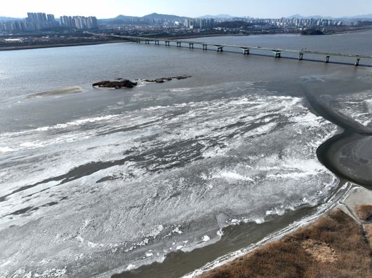 전국 곳곳에 한파특보가 발효된 11일 경기 고양시 일산대교 북단 인근의 한강이 얼어붙어 있다. 기상청은 12일에도 영하 10도 안팎의 강추위가 기승을 부릴 것으로 전망했다. 신태현 기자 holjjak@ |
