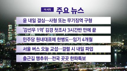 ■ 윤 내일 결심…사형 또는 무기징역 구형 ■ '강선우 1억' 김경 첫조사 3시간반 만에 끝 ■ 민주당 원내대표에 한병도…임기 4개월 ■ 서울 버스 오늘 교섭…결렬 시 내일 파업 ■ 출근길 맹추위…전국 곳곳 한파특보 [저작권자(c) YTN 무단전재, 재배포 및 AI 데이터 활용 금지] 대한민국 24시간 뉴스채널 [YTN LIVE] 보기 〉 [YTN 단독보도] 모아보기 〉