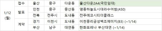 부동산 정보업체 부동산R114에 따르면 12일 오늘은 울산 중구 '울산다운2A4(국민임대)' 단지의 청약 접수가 진행된다. 또 인천 중구 '영종하늘도시대라수어썸(A50)'과 전북 전주시 '전주에코시티더클래스' 단지는 이날 당첨자를 발표한다.