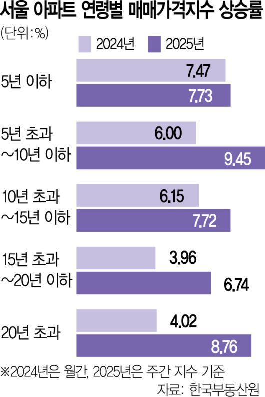 구축 아파트 강세는 과거와 비교하면 더 뚜렷하게 나타난다. 준공 20년 초과 아파트의 매매가격지수는 지난해 8.76% 올라 준신축과 함께 서울 집값 상승을 견인했지만, 2023년에는 2.84% 감소해 상승률이 가장 낮았고 2024년에도 4위에 그쳤다.