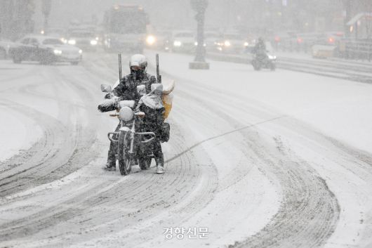 갑작스러운 폭설이 내린 지난해 2월6일 시민들이 눈을 맞으며 서울 세종로 사거리 인근을 지나고 있다. 문재원 기자 |