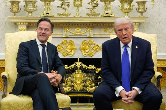 [워싱턴=AP/뉴시스] 사진은 도널드 트럼프 미국 대통령(오른쪽)이 지난해 10월 22일(현지 시간) 백악관 집무실에서 마르크 뤼터 북대서양조약기구(나토) 사무총장과 회담하는 모습. 2026.01.12. |