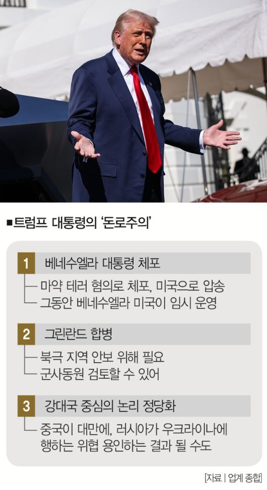트럼프 대통령은 먼로주의보다 극단적인 입장을 취하고 있다. 대표적인 사례는 '베네수엘라 대통령 체포 사태'다. 미국은 지난 3일(현지시간) 기습적인 군사작전을 펼쳐 니콜라스 마두로 베네수엘라 대통령 내외를 체포했다.