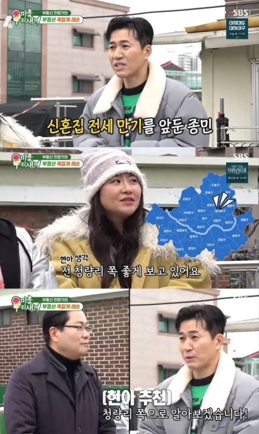 이날 김종민은 “신혼집 전세만기가 얼마 안 남았다. 집을 사야하는지?”라고 물었다. 조현아는 돈보다 부동산의 가치가 더 빨리 오른다며 매매를 추천했다. 부동산 전문가도 지금 집을 사면 10년 후에는 오를 가능성이 높다고 덧붙였다.