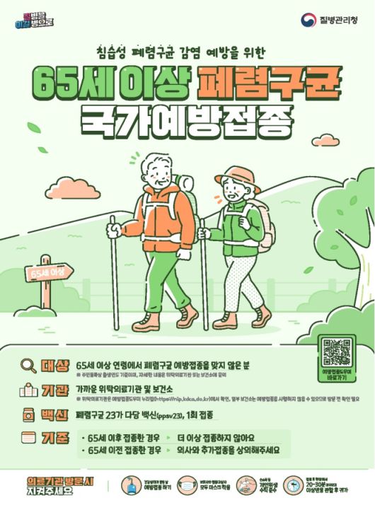 접종 대상자는 65세 이상(1961년 12월 31일 이전 출생자)으로, 폐렴구균 23가 다당 백신을 아직 접종하지 않은 어르신이다. 신분증을 지참해 보건소 또는 관내 위탁의료기관을 방문하면 무료로 접종받을 수 있다.