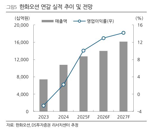 DS투자증권은 한화오션의 4분기 실적이 일부 일회성 요인과 해양플랜트 부문 적자 영향으로 시장 기대치를 소폭 하회할 것으로 내다봤다. 4분기 매출액은 3.3조 원으로 전년 대비 소폭 증가하고, 영업이익은 3630억 원으로 두 자릿수 이익률을 기록할 전망이다. 다만 임직원 관련 일회성 비용이 확대됐고 해양플랜트 부문의 적자가 이어지며 컨센서스 대비 영업이익이 약 9% 낮을 것으로 예상했다.