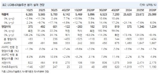 4분기 실적은 가이던스를 소폭 웃돌 것으로 추정했다. 2025년 4분기 매출은 6조 1000억원으로 전년 대비 4.8% 감소하나 전 분기 대비 7.7% 증가했고, 영업손실은 1220억원으로 전망했다. 원·달러 환율 강세와 일회성 수익이 실적 방어에 기여하리란 평가다. AMPC를 제외한 영업손실은 4548억원으로 내다봤다.