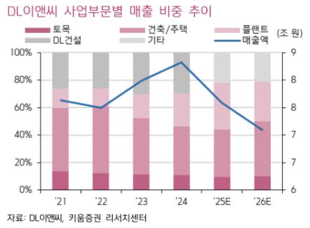 신 연구원은 또 "DL이앤씨는 2년간 플랜트 부문에서 대형 수주가 부재한 상황"이라며 "주요 플랜트 현장들의 잔여 계약 잔고를 고려 시 내년에도 외형 하락은 불가피할 것으로 전망된다. 또한, 자회사 DL건설의 건축 부문도 ‘22년 착공 물량이 대체로 준공될 것으로 전망되는 만큼, 2026년 외형 감소가 지속될 것"이라고 내다봤다.