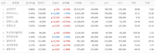 12일 네이버페이증권에 따르면 검색 상위 종목은 삼성전자, SK하이닉스, 현대차, 한화시스템, 한화오션 등이다.