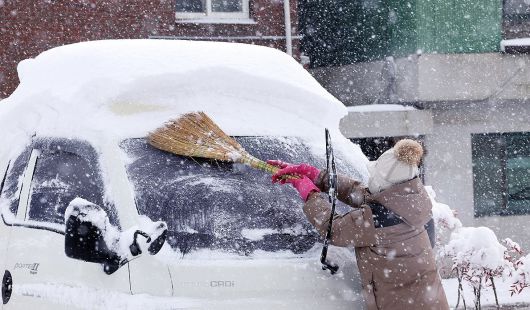 대설경보가 발효된 전날 전남 무안군 몽탄면 한 주차장에서 주민이 차량에 쌓인 눈을 빗자루로 치우고 있다. |