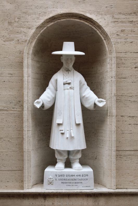 바티칸 성 베드로 대성전 외부 벽감에 설치된 성 김대건 안드레아 신부 성상./제공=천주교 주교회의 |