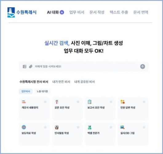 이재준 수원시장은 "인공지능 업무 비서 서비스 도입으로 수동·반복적인 행정 업무 수행 방식을 개선하고, 인공지능을 활용한 스마트 행정 환경을 조성할 것"이라며 "행정 전반에 인공지능 활용을 확산해 공직자들이 창의적이고 가치 있는 업무에 집중할 수 있는 업무 환경을 만들어 가겠다"고 밝혔다.