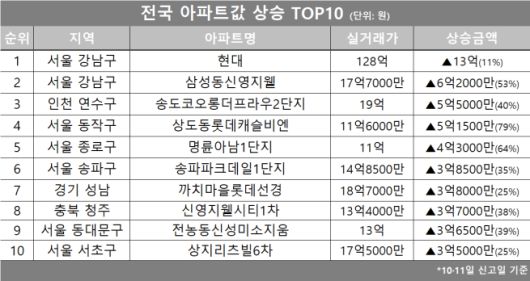부동산 플랫폼 호갱노노에 따르면 10·11일 신고 기준 전국 아파트 가운데 실거래가 상승 폭이 가장 컸던 단지는 서울 강남구 ‘현대’로 나타났다. 이 단지는 128억 원에 거래되며 직전 거래 대비 13억 원(11%) 상승했다.