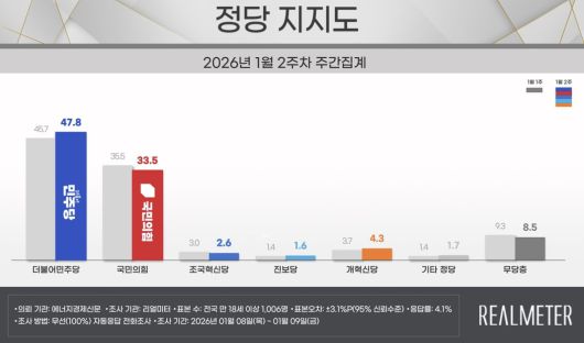 리얼미터가 에너지경제신문 의뢰로 지난 8~9일 전국 18세 이상 1006명을 상대로 진행해 이날 발표한 여론조사 결과를 보면, 정당 지지도는 여당인 더불어민주당이 47.8%로 지난주 조사보다 2.1%포인트 상승했다. 국민의힘은 33.5%로 2.0%포인트 하락했다. 개혁신당은 0.6%포인트 올라 4.3%, 조국혁신당은 0.4%포인트 하락해 2.6%, 진보당은 0.2%포인트 올라 1.6%였다.
