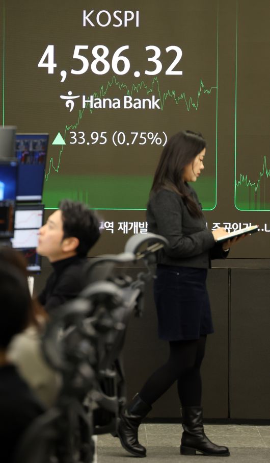 코스피가 종가 기준 최고치를 기록한 9일 오후 서울 중구 하나은행 딜링룸 전광판에 코스피가 전 거래일 보다 33.95 포인트(0.75%) 오른 4586.32 포인트를 나타내고 있다. 뉴시스 |