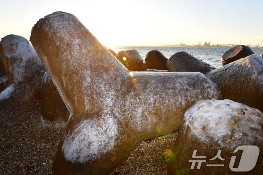 (포항=뉴스1) 최창호 기자 = 12일 경북 포항시 북구 환여동 앞 바다에 설치된 테트라포트 위에 바닷물이 얼어 붙어있다. 2026.1.12/뉴스1