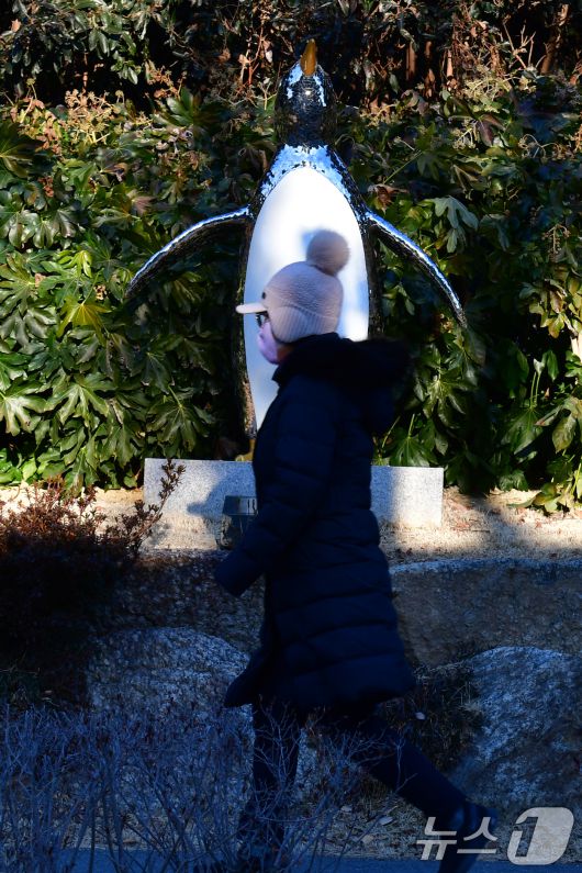 (포항=뉴스1) 최창호 기자 = 12일 경북 포항시 남구 대잠동 철길숲에서 두터운 옷차림의 시민이 펭귄 조형물 앞으로 걸어가고 있다. 2026.1.12/뉴스1
