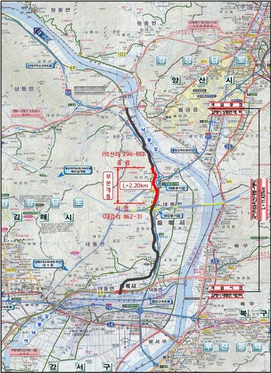 12일 김해 동부권을 가로지르는 국지도 69호선 일부 구간이 개통되면서 대동·상동 지역 주민들의 출·퇴근길 교통 여건이 한층 개선될 전망이다. 사진은 국지도 69호선 부분개통 구간 위치도. /김해시청 |