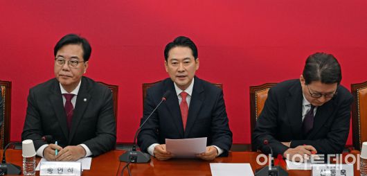 아시아투데이 송의주 기자 = 장동혁 국민의힘 대표(가운데)가 12일 국회에서 열린 최고위원회의에서 발언을 하고 있다.