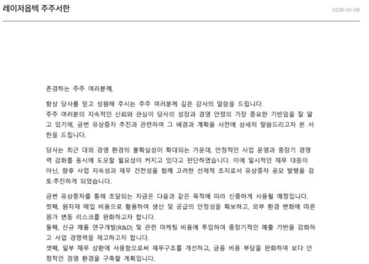 레이저옵텍은 이번 유상증자로 확보한 자금을 운영자금과 채무상환자금으로 사용할 계획이다. 시장에서는 주식 수 증가에 따른 단기적인 지분 희석 부담과 함께 유상증자 필요성 자체를 재무 상황과 연결해 바라보는 시각도 나온다.