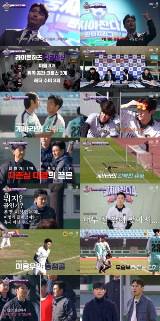 11일 방송된 JTBC 대표 스포츠 예능 ‘뭉쳐야 찬다4’(이하 ‘뭉찬4’) 39회에서는 ‘판타지리그’ 최대 라이벌인 안정환 감독의 ‘FC환타지스타’와 이동국 감독의 ‘라이온하츠FC’가 정규리그 마지막 경기에서 맞붙었다. 상대 전적 2승 2패로 팽팽했던 두 팀은 이날 경기에서도 물러섬 없는 공방을 펼치며 2:2 무승부를 기록했다. 이날 방송은 종편 채널 동 시간대 예능 1위를 차지했다. (닐슨코리아 제공, 유료방송가구 전국 기준)